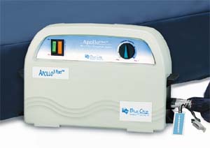 The Apollo 3-PortTM Alternating Pressure Mattress System with Low Air Loss incorporates the features that clinicians demand for their patients in a portable system. The mattress utilizes 16 independent 8" deep air cells to provide pressure redistribution for the prevention and treatment of Stages I-IV pressure ulcers. User friendly controls and ease of setup make Apollo - 3 PortTM ideal for institutional use and the home-bound patient. The mattress is designed to fit all standard hospital beds. Apollo 3-PortTM support patient weights up to 350 lbs. Apollo 3-PortTM meets California Technical Bulletin #117 for fire retardancy. An optional fire barrier is available to meet the most stringent fire safety requirements when requested.